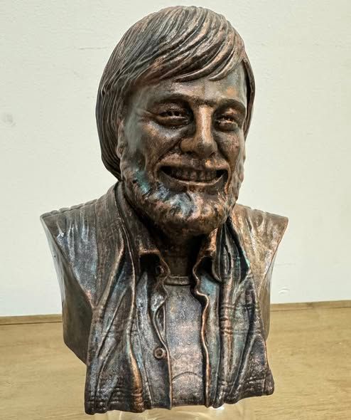The bust depicts George A. Romero as he appeared during the production of the film and is on display in the mall's Romero Court, former location of the famous clock of nations. This 3D printed replica was canned directly from the original bust that was sculpted by Christian Stavrakis with assistance from Brian McGuire. This replica bust was hand painted by Christian Starakis.