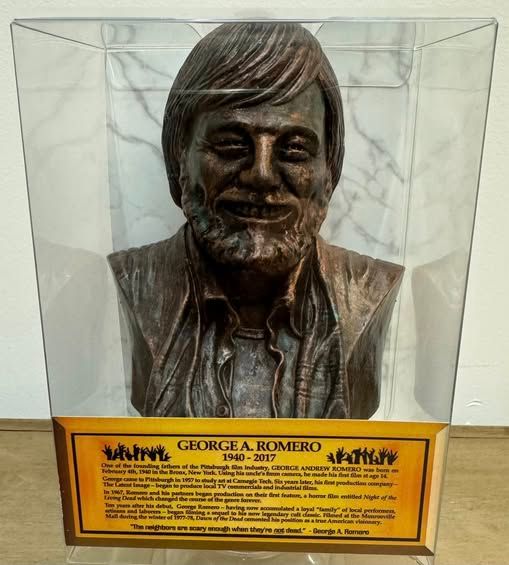 A Living Dead Museum Exclusive.Mini-Bust Replica of George A. Romero as seen in the Monroeville Mall. Bust is 1/4 scale of the original memorial bronze bust of filmmaker, George A. Romero. The original bust was installed and dedicated at Monroeville Mall in June 2018, the 40th Anniversary of the filming of DAWN OF THE DEAD.