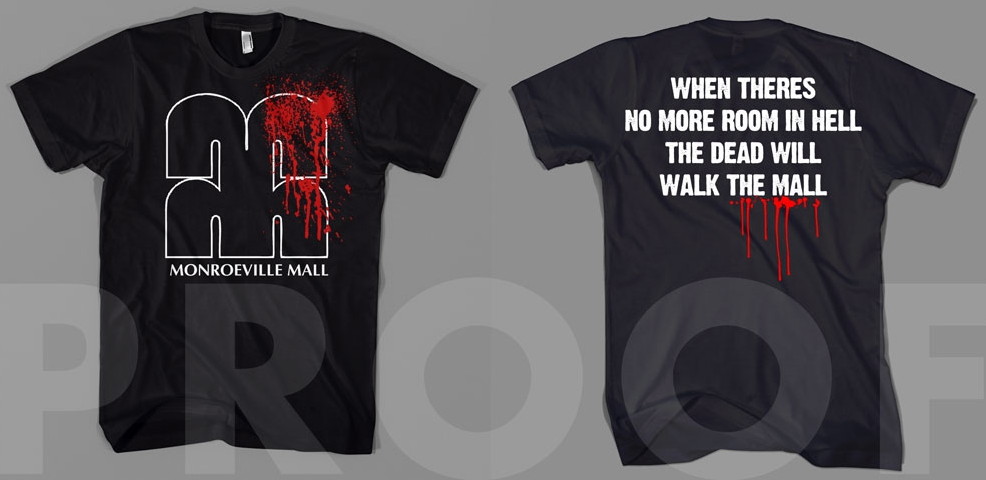 Any self-respecting zombie fan knows that the Monroeville Mall is the setting and film production set for the 1978 George A. Romero's "Dawn of the Dead". One of our best selling shirts in the mall features the original 1970's Monroeville Mall logo on its front and the phase, "WHEN THERE'S NO MORE ROOM IN HELL THE DEAD WILL WALK THE MALL" on its back. And, oops, I guess we got a little blood on it too! (it happens in our mall).T-Shirt is black, 100% Pre-Shunk cotton.
