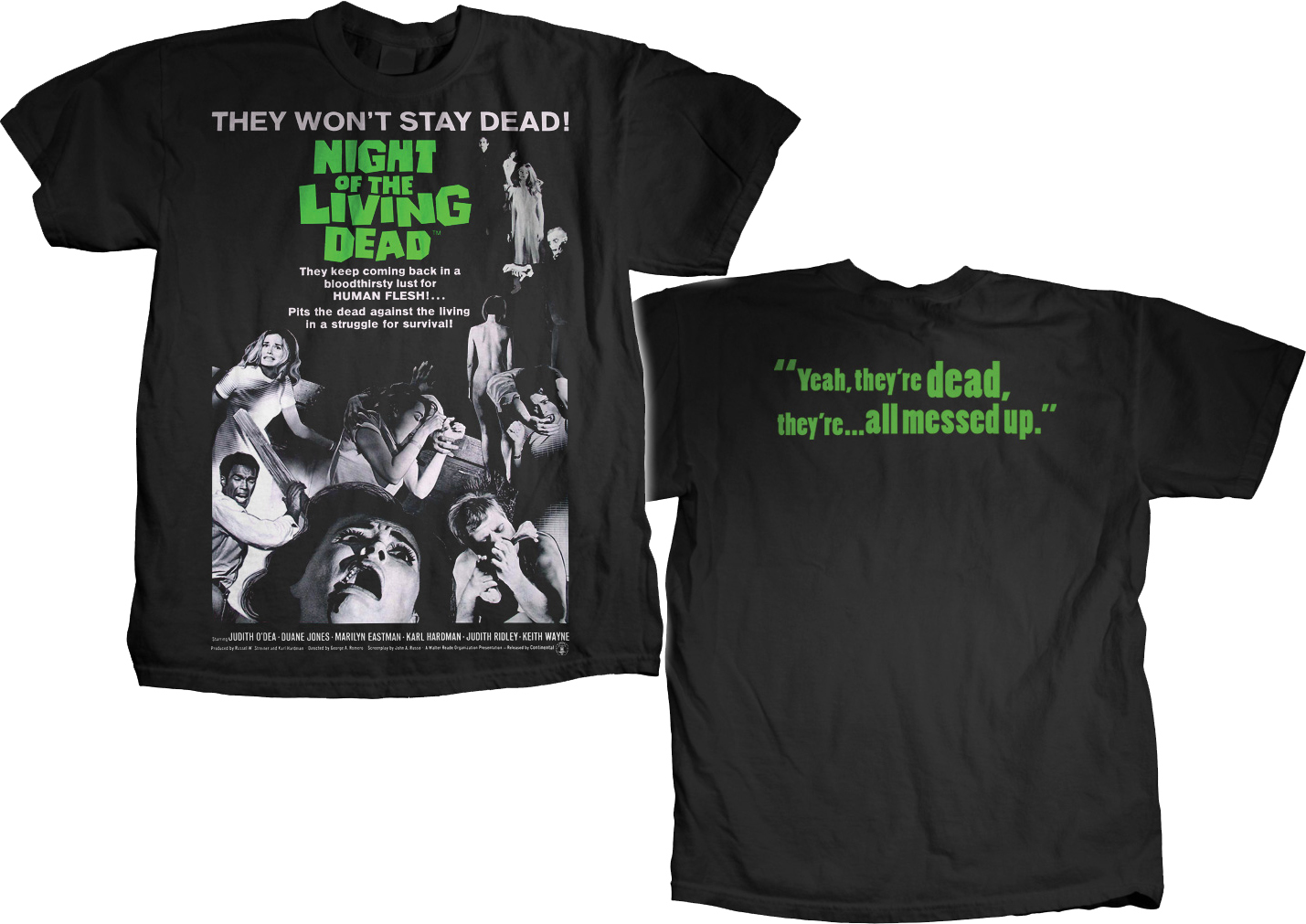 The classic Night of the Living Dead Poster 1-sheet art on the front. The classic quote, "They're dead, they're all messed up" on the back.