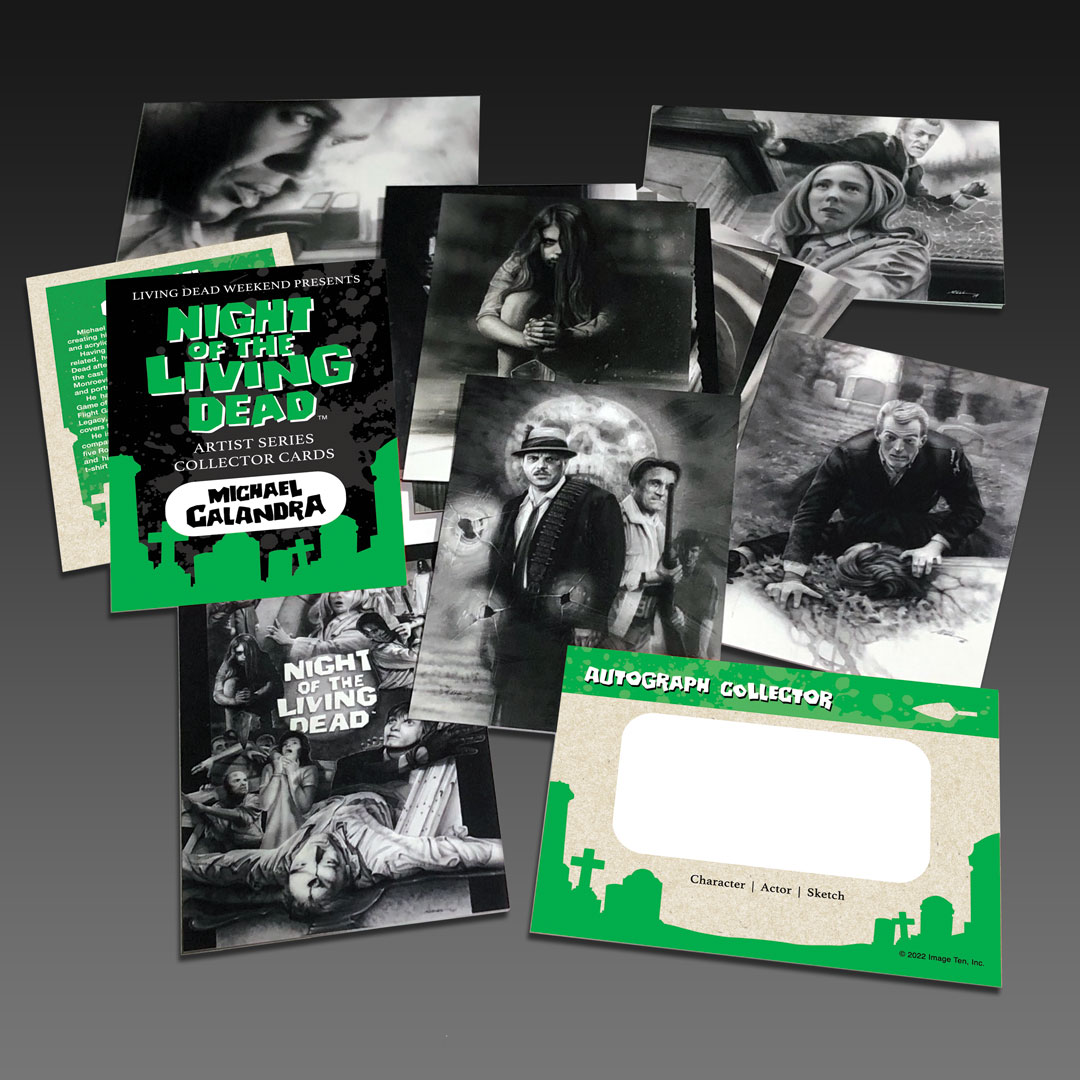 NIGHT OF THE LIVING DEAD Artist Series Trading Card Set Series 1 GREEN Version. The first series of this ongoing set features artwork from Michael Calandra. The set includes 12 art cards and 1 title card with artist bio. Each art card features a back area for autographs and sketches.This is the standard edition green version set that was produced as a companion parallel set to the limited edition for the VIP Pass holders at Living Dead Weekend: Evans City 2022. Card set is fully licensed from Image Ten.