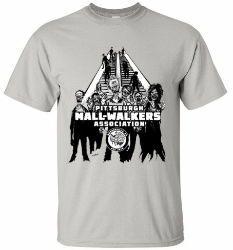 Does anybody actually shop in malls anymore? Sure, there's the mall walkers...but are they walkers or zombies? The first known mall walkers have been documented back to the Monroeville Mall in Pittsburgh, PA in 1978 by film maker, George A. Romero. Now with a full fledged association, the Pittsburgh Mall Walkers have an official Tee Shirt available exclusively here.Design and art by Terry Callen of Screaming Brain Studio. Printed in a black and white screen on a light grey 100% heavy cotton shirt.