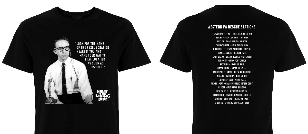 Newscaster- "Look for the name of the Rescue Station Nearest You" fully licensed Limited Edition NIGHT OF THE LIVING DEAD T-shirt.Front design shows Charles Craig as the newscaster from NIGHT OF THE LIVING DEAD. Back design shows the list of Western PA Rescue Stations as listed in the news report segments in the film. All real towns and places in Western PA!
